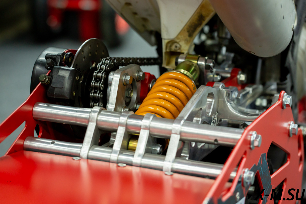 Амортизаторы : однотрубные, газомасляные, двухстороннего действия, с регулировками сжатия, отбой и преднатяга пружины. С выносом 2-3 см на верхнем креплении, что дает небольшую прогрессию.